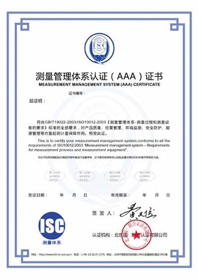 测量管理体系认证证书是指由第三方机构按照GB/T19022-2003/ISO10012-2003《测量管理体系―测量过程和测量设备的要求》标准对组织在产品质量、经营管理、节能降耗、环境监测等方面是否满足标准要求进行审核。企业获得测量管理体系认证证书,就是得到了政府对企业满足ISO10012国际标准的认可。组织已经建立完善的测量管理体系,并有文件能够证明体系有效运行至少3个月。组织可向认证机构申请体系认证。